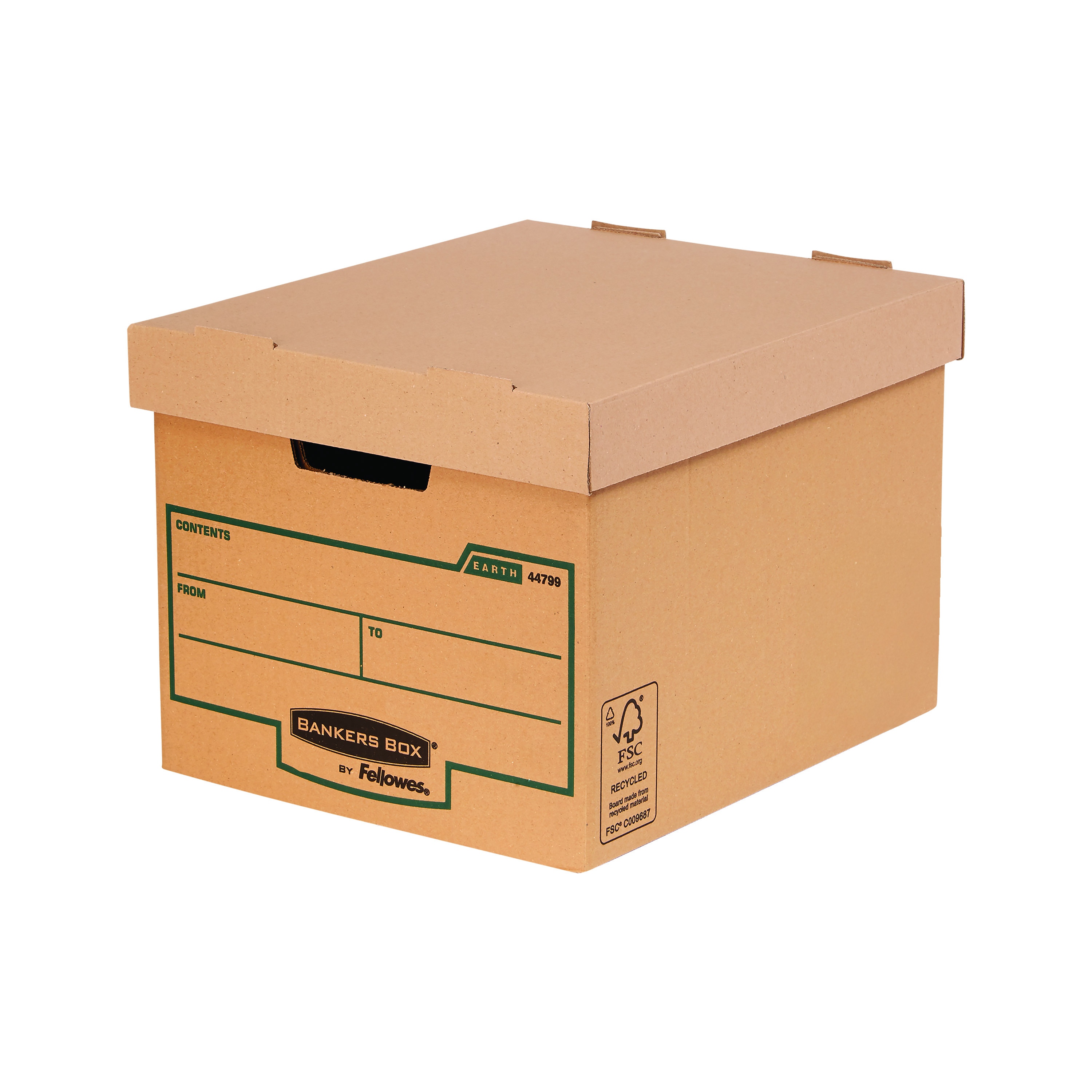 This Bankers Box Earth Series heavy duty storage box features a triple layer of board to the end panels and a double layer to sides and base. It comes with reinforced hand holes that resist tearing and make these boxes comfortable to carry. Compatible with transfer files, ring binders, lever arch files and suspension files. The over-sized lid means it can also be used with suspension files. This sturdy, corrugated storage box can also be used to transport files off site or between home and work. These storage boxes are made from certified 100% recycled board and are 100% recyclable. All inks used are water based and adhesives used are solvent free.